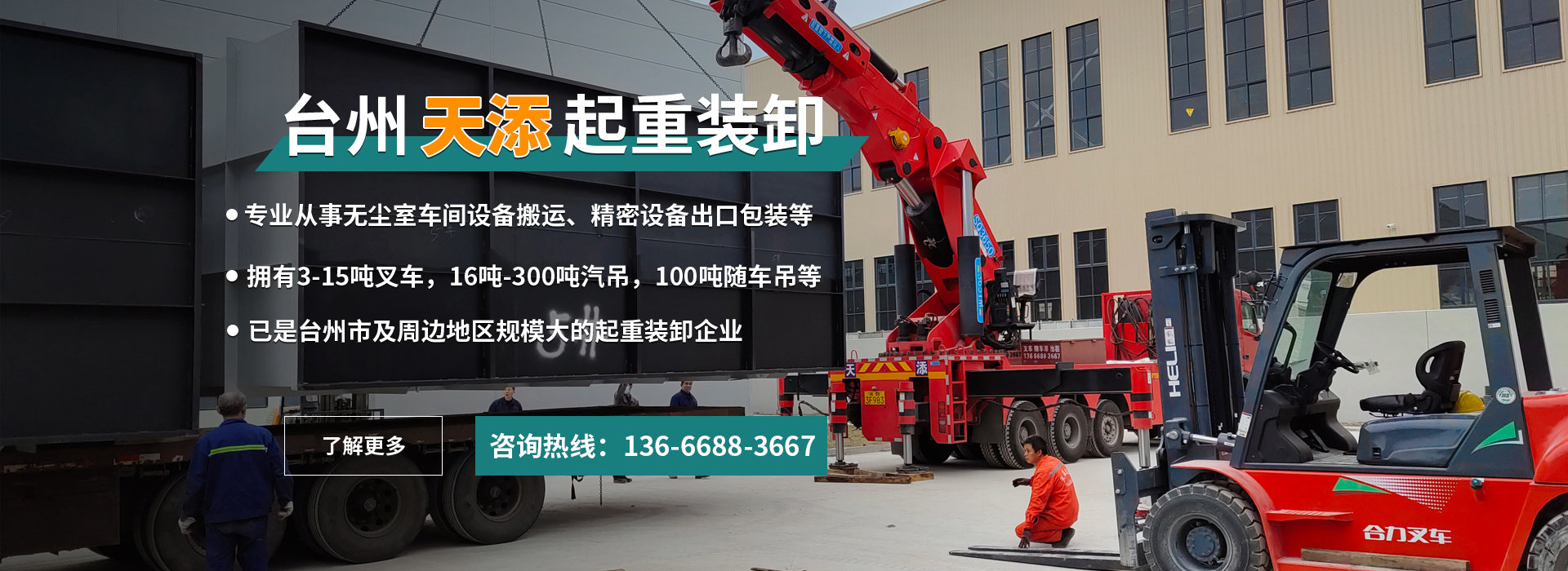 臺州天添起重裝卸有限公司專業從事無塵室車間設備搬運、精密設備出口包裝、木箱出口包裝、設備搬運、起重裝卸、大型設備搬運、起重吊裝、大件運輸、設備拆卸安裝服務,公司擁有專業工程技術人員多名,擁有3-15噸叉車,16噸-300噸汽吊,100噸隨車吊,另有起重吊裝、包裝、安裝作業機械設備多臺。現已是臺州市及周邊地區規模較大的起重裝卸企業。主要經營無塵室車間設備搬運、精密設備出口包裝、木箱出口包裝、設備搬運、起重裝卸、大型設備搬運、起重吊裝、大件運輸、設備拆卸安裝等業務。我們以服務客戶為己任,追求安全、高效、及時、認真的服務宗旨。憑借先進的裝卸設備和優秀的人員素質,本公司愿為全市新老客戶提供優質的服務。